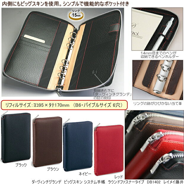 商品名 Davinci ダ・ヴィンチグランデ ピッグスキン システム手帳 聖書サイズ 品番 DB1402 サイズ 約)縦213×横134×厚さ25mm 重さ:約)339g 材質 イタリア製ピッグスキン 豚革 リフィル 縦170×横95mm (B6・バイブルサイズ 6穴) 仕様 リング内径-約15mm、高級ギフトパッケージ入 リフィルセット付(フリーマンスリー、ノート、プロジェクト他) ※革の性質上 名入れには適しません。